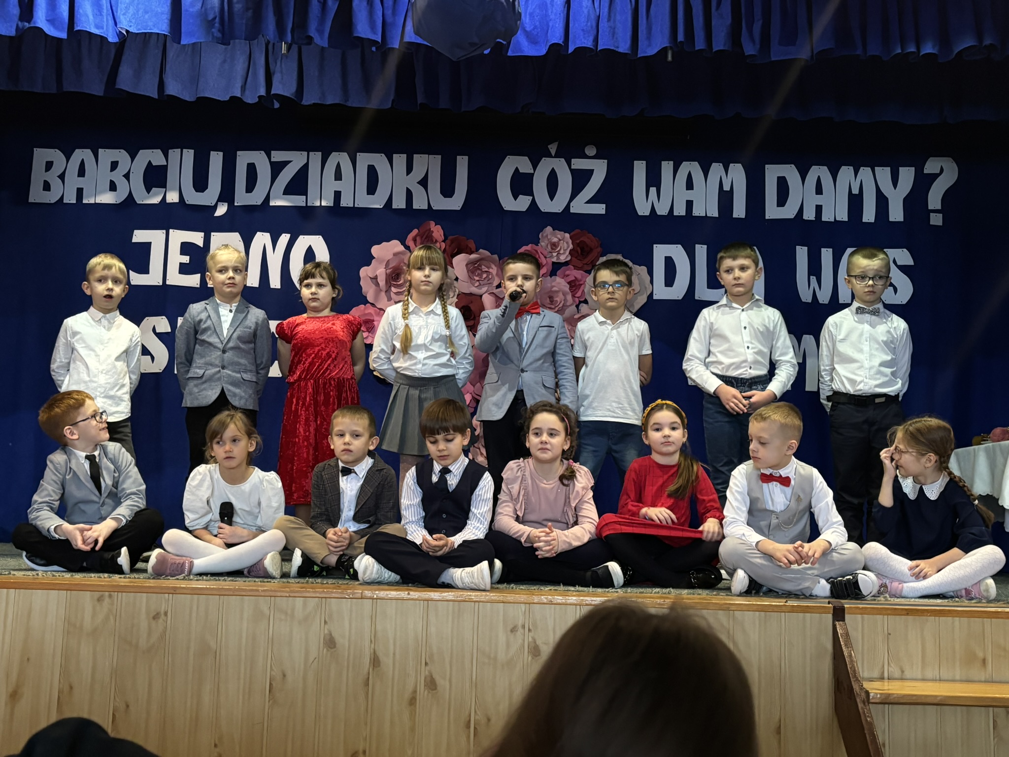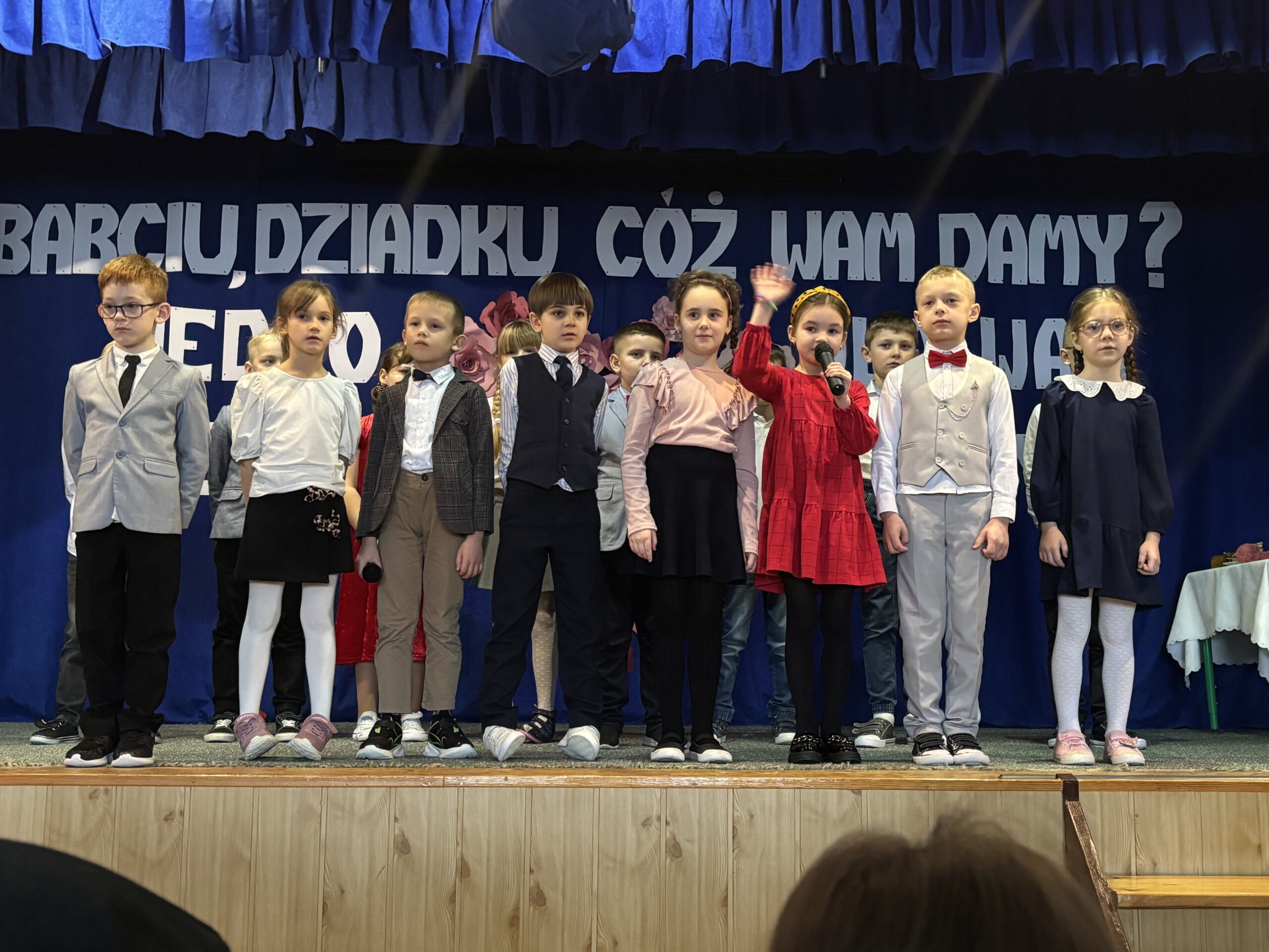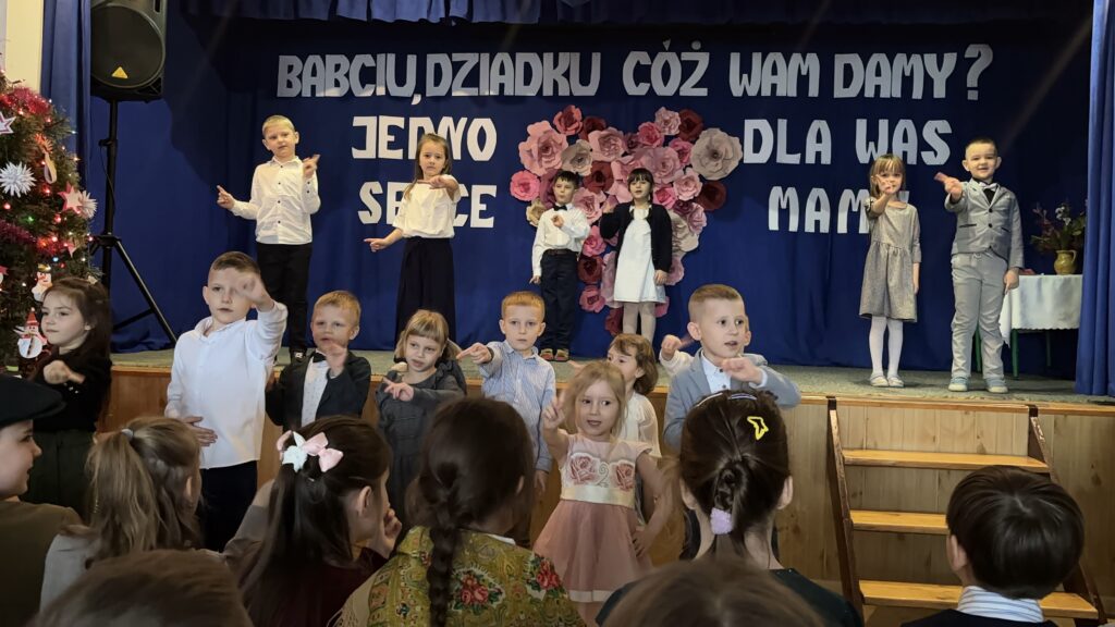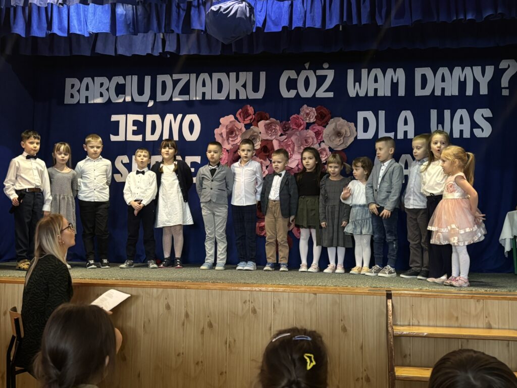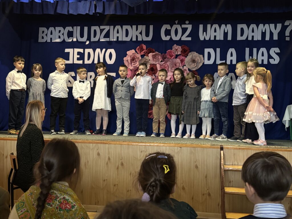 Następnie rozpoczęła się część artystyczna, w której zaprezentowała się młodsza część naszej społeczności szkolnej pod czujnym okiem swoich wychowawców. Dzieci przygotowały piękne wiersze, piosenki, a także humorystyczne scenki, które wywołały wiele uśmiechów na twarzach zaproszonych gości. Na zakończenie występów przedszkolaki zachwyciły wszystkich radosnym tańcem. Po części artystycznej dzieci wręczyły swoim Babciom i Dziadkom własnoręcznie wykonane laurki oraz drobne upominki, a następnie zaprosiły gości na słodki poczęstunek. To był niezwykle miły dzień, pełen ciepła, wdzięczności i rodzinnej atmosfery ![]()