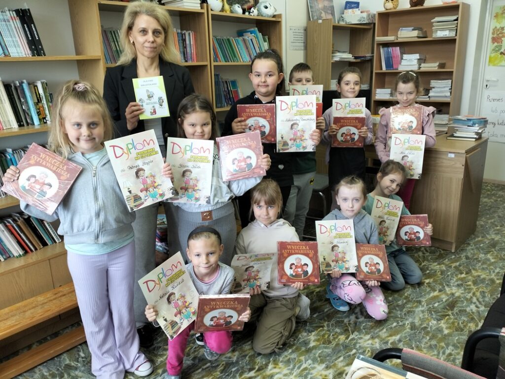 W Dniu Bibliotekarza i Bibliotek uczniowie pierwszej klasy zostali oficjalnie przyjęci do grona czytelników naszej szkolnej biblioteki. Głównym celem uroczystości było zachęcenie najmłodszych uczniów do korzystania z biblioteki szkolnej, wypożyczania książek oraz nieustannego rozwijania umiejętności czytania. Zanim jednak uczniowie złożyli przyrzeczenie, odpowiadali na bajkowe zagadki. Dowiedzieli się, jak należy zachowywać się w bibliotece oraz jak postępować z książkami. Poznali zbiory naszej biblioteki, zasady udostępniania księgozbioru. Dowiedzieli się, co zrobić, gdy książka zginie lub się zniszczy.