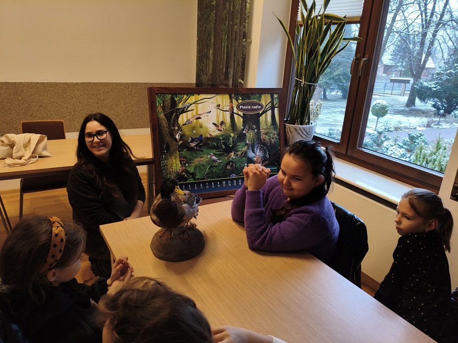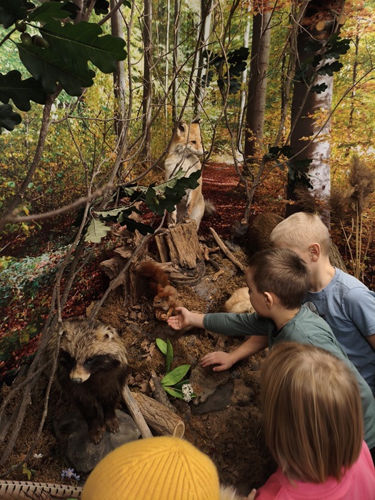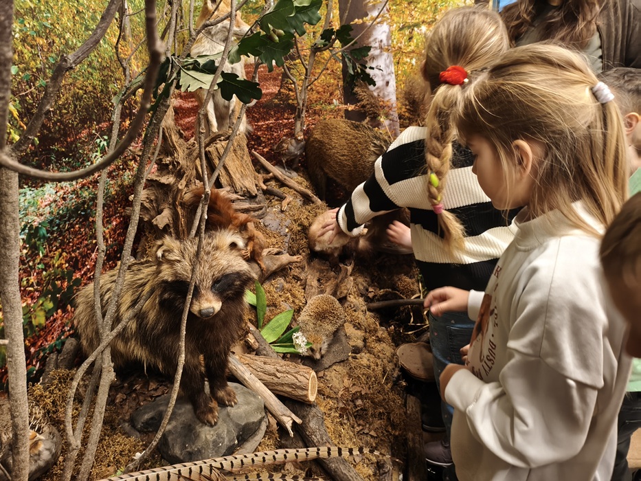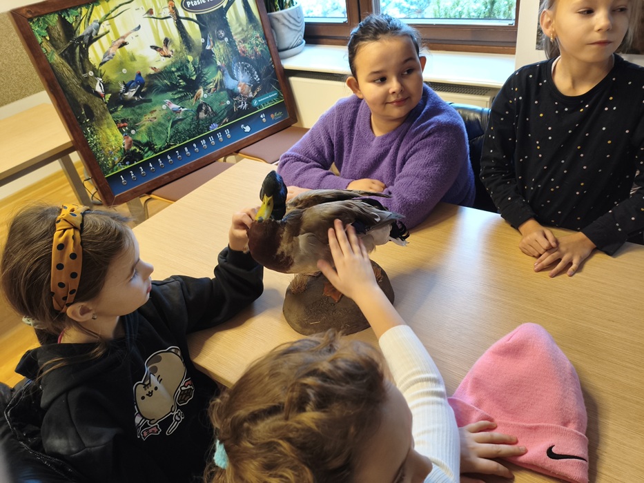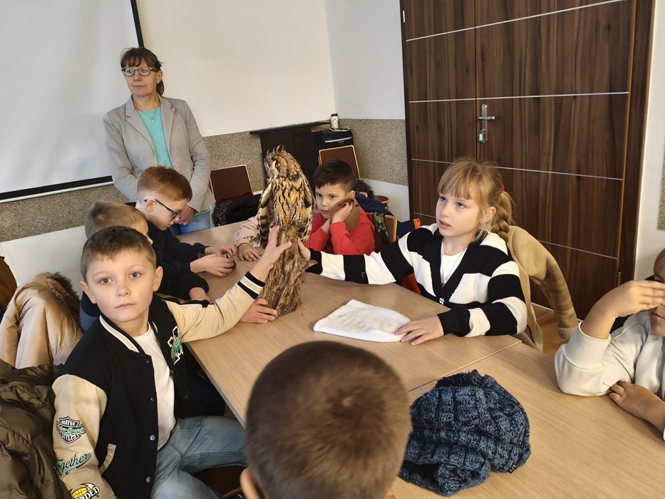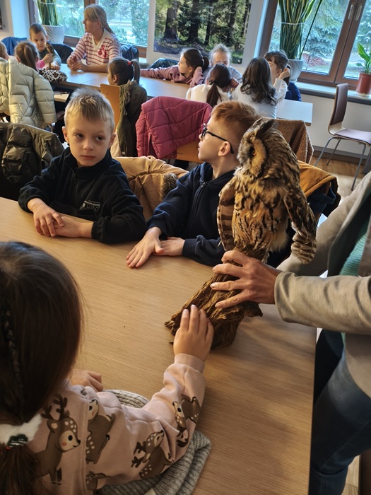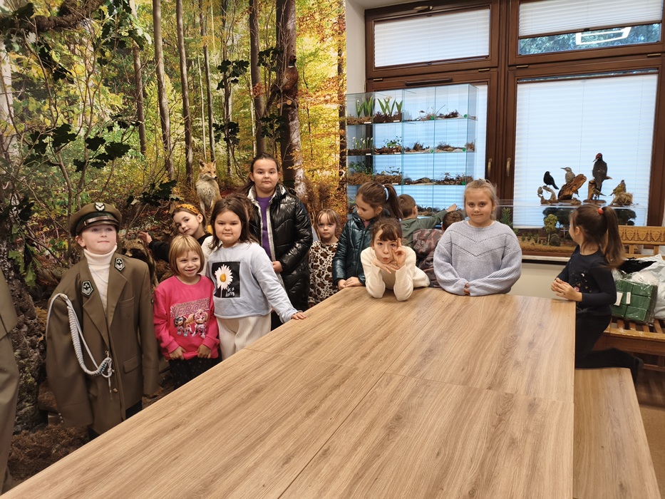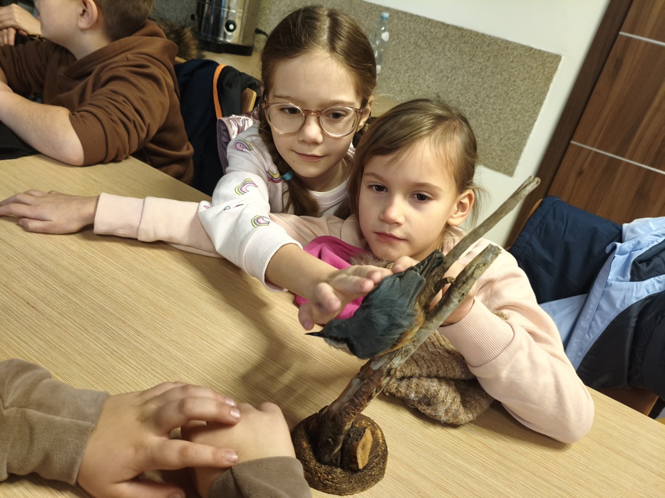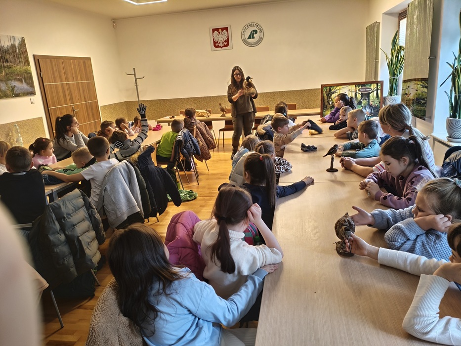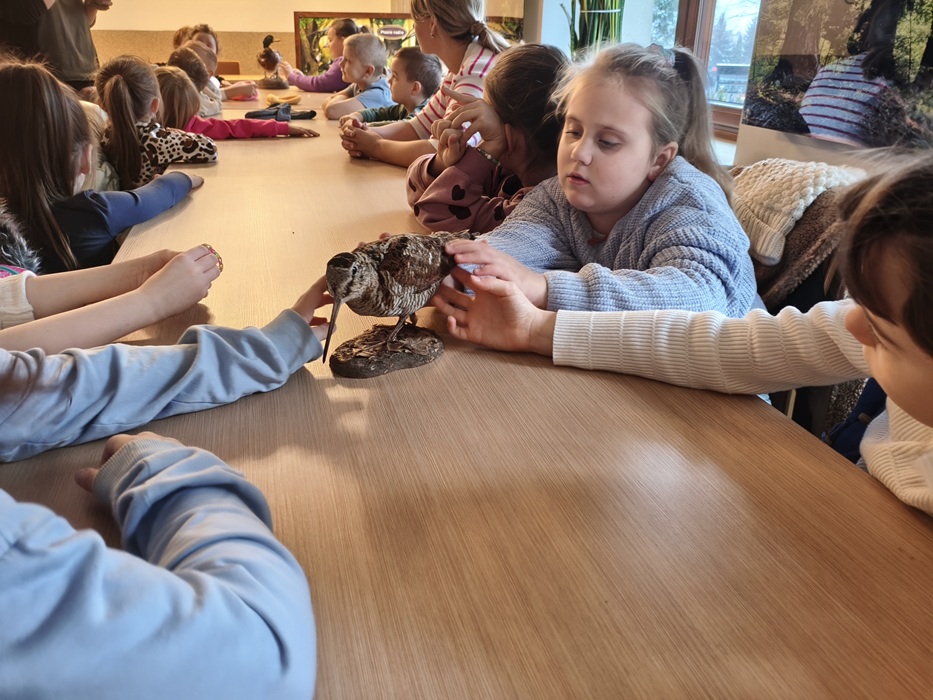 Pierwszym punktem programu była wizyta w nadleśnictwie, gdzie dzieci uczestniczyły w ciekawych zajęciach o ptakach. Mogły usłyszeć ich odgłosy, obejrzeć z bliska różne okazy, a nawet dotknąć niektórych z nich. Następnie odwiedziły leśną salę edukacyjną pełną eksponatów związanych z naturą – mali odkrywcy byli zachwyceni! 🌿🦉